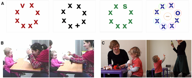 В дополнение к симптомам, составляющим его сердцевину, т.е. трудностям с социальным взаимодействием и коммуникацией, а также ограниченному и повторяющемуся поведению, аутизм также характеризуется аспектами улучшенного восприятия. Одним из хорошо воспроизводимых результатов является превосходное выполнение задач на визуальный поиск, в которых участникам нужно указать наличие одного отличающегося элемента среди ряда других. Вносят ли эти аспекты улучшенного восприятия вклад в возникновение основных симптомов аутизма, пока остаётся под вопросом. Атипичности в восприятии и социальном взаимодействии могут отражать совместно проявляющиеся, но биологически независимые патологии, как это было предложено Ф. Хаппе и А. Рональд в модели "разбиваемого на части" фенотипа аутизма. Проверка этой гипотезы в её связи с развитием детей в настоящее время стала возможной благодаря длительному наблюдению групп малышей с высоким риском, таких как младшие родные братья и сёстры детей с расстройствами аутического спектра (РАС). Приблизительно у 20% младших братьев и сестёр самих диагностируется аутизм, а у ещё до 30% проявляются повышенные уровни аутических симптомов. Команда учёных из Великобритании под руководством Теодоры Глига использовала отслеживание глаз, чтобы измерить спонтанную ориентировку на целевую букву или символ (O, S, V и +), размещённую среди отвлекающих букв (X; рисунок 1). Также с помощью диагностических методик для младенцев и детей младшего возраста оценивались симптомы аутизма. Улучшенное выполнение задач на визуальный поиск в 9 месяцев предсказывало более высокий уровень симптомов аутизма в 15 месяцев и в 2 года. Атипичности восприятия у младенцев, таким образом, оказались внутренне связаны с формирующимся аутическим фенотипом.